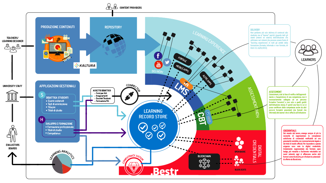 - Produzione e delivery dei contenuti: soluzioni a supporto della produzione di contenuti (L2K, il nuovo servizio basato sulla suite Kaltura), il delivery che avviene ovviamente tramite piattaforme LMS (in primis Moodle) ma non solo, anche app mobile e altri canali, per poi integrarsi a livello centralizzato in quello che definiamo Learning Record Store.